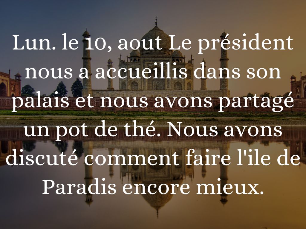 Lun. le 10, aout Le président nous a accueillis dans son palais et nous avons partagé un pot de thé. Nous avons discuté comment faire l'ile de Paradis encore mieux.