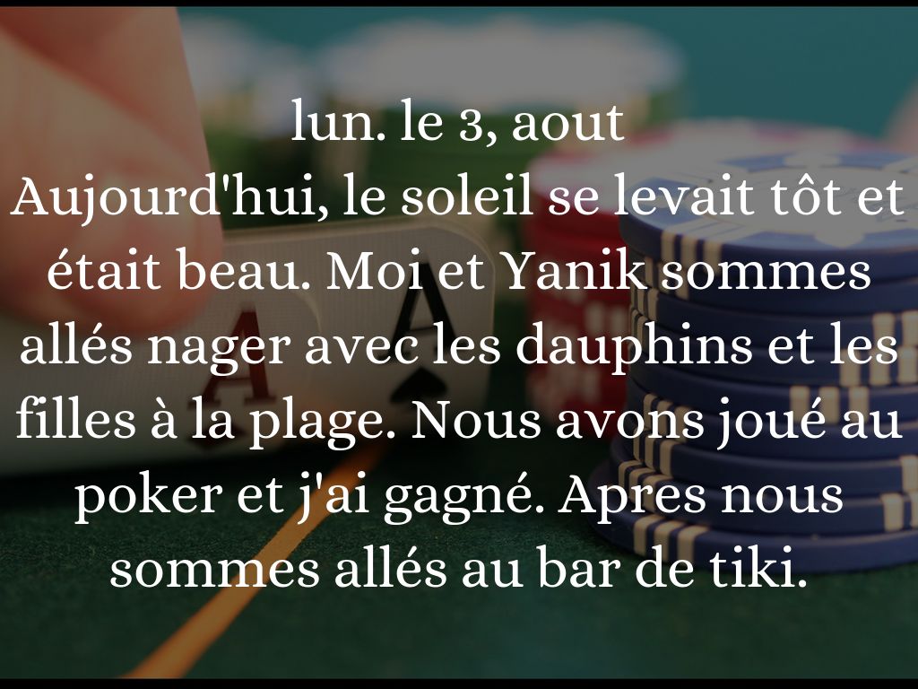 Aujourd'hui, le soleil se levait tôt et était beau. Moi et Yanik sommes allés nager avec les dauphins et les filles à la plage. Nous avons joué au poker et j'ai gagné. Apres nous sommes allés au bar de tiki.