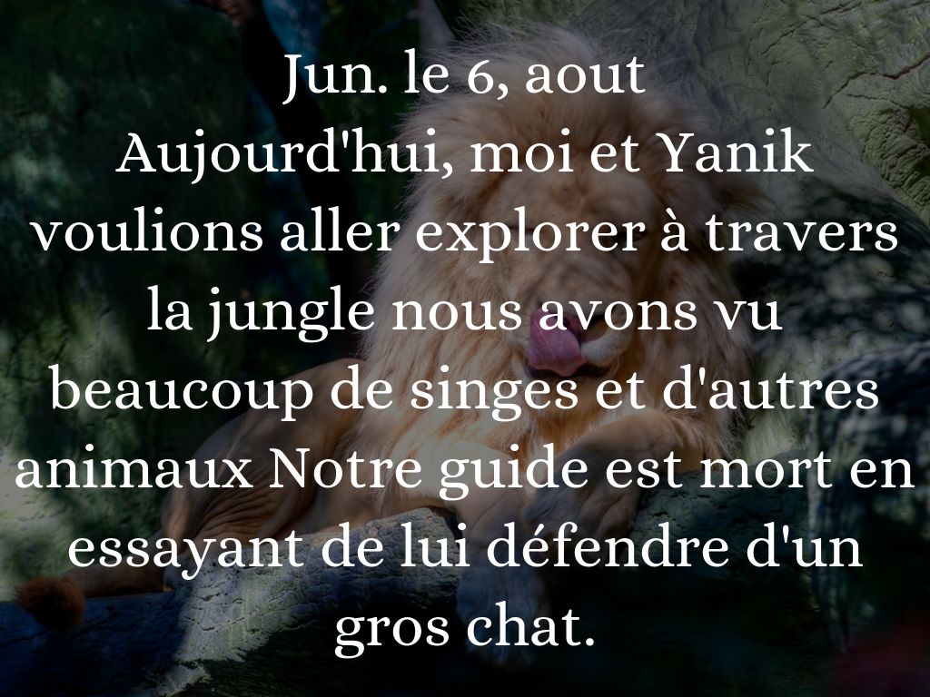 Aujourd'hui, moi et Yanik voulions aller explorer à travers la jungle nous avons vu beaucoup de singes et d'autres animaux Notre guide est mort en essayant de lui défendre d'un gros chat.