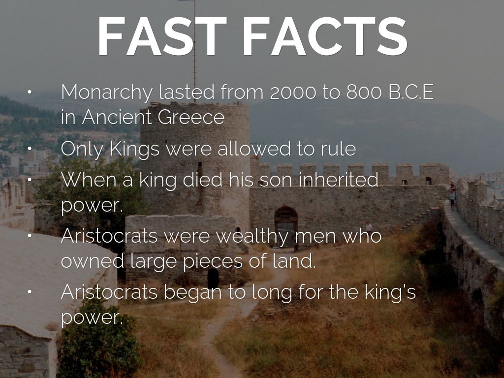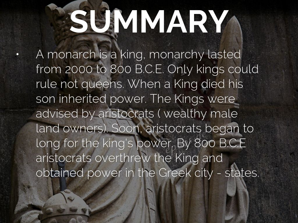 A monarch is a king, monarchy lasted from 2000 to 800 B.C.E. Only kings could rule not queens. When a King died his son inherited power. The Kings were advised by aristocrats ( wealthy male land owners). Soon, aristocrats began to long for the king's power. By 800 B.C.E aristocrats overthrew the King and obtained power in the Greek city - states.