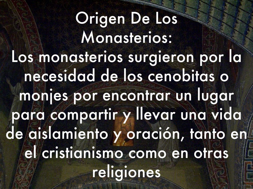 Origen De Los Monasterios: Los monasterios surgieron por la necesidad de los cenobitas o monjes por encontrar un lugar para compartir y llevar una vida de aislamiento y oración, tanto en el cristianismo como en otras religiones