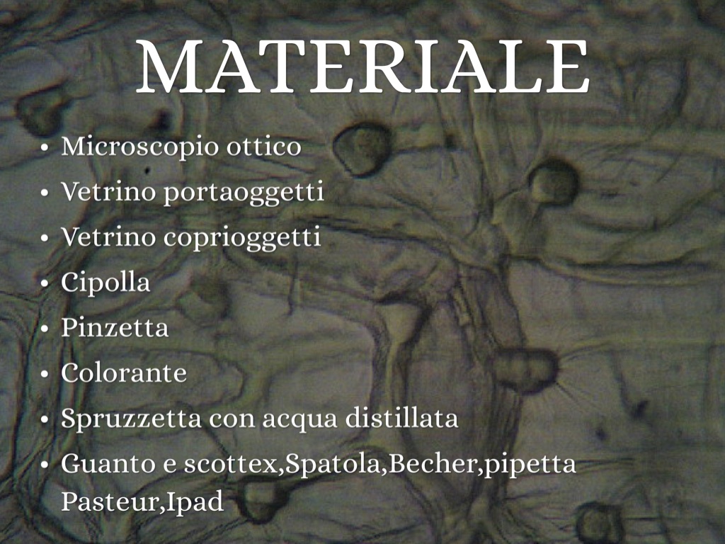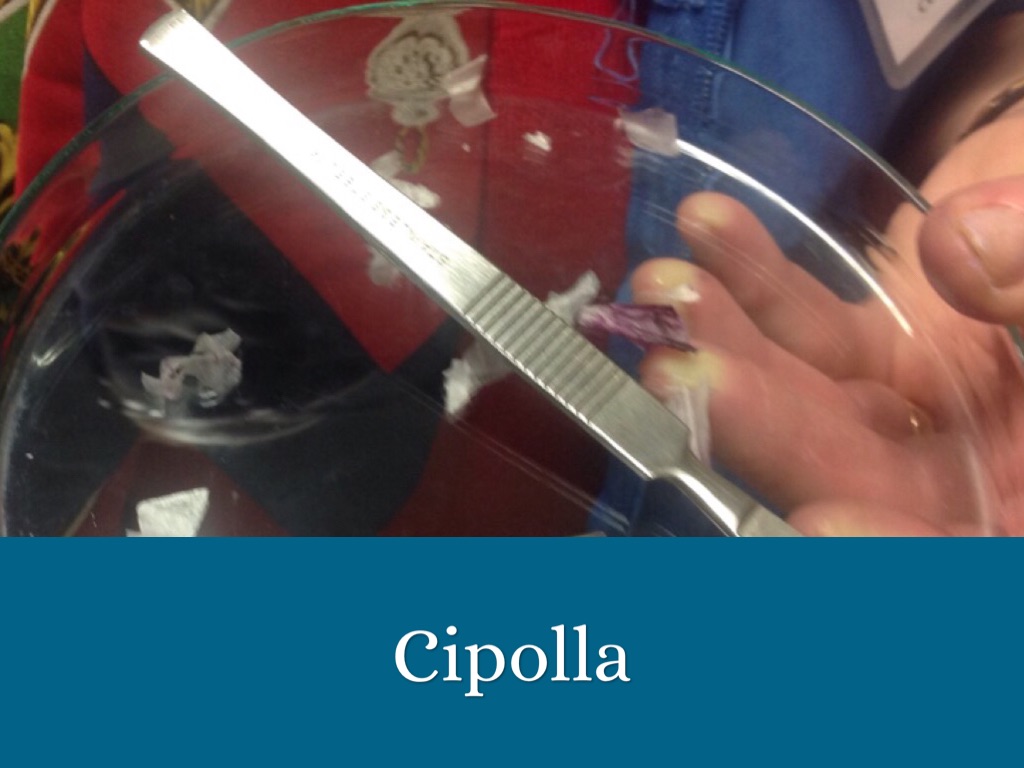 PROCEDIMENTO: Inizialmente si prepara il vetrino da studiare : si toglie uno strato interno della cipolla mediante l'uso di una pinzetta, si taglia ricavando in questo modo dei piccoli pezzettini utilizzando la spatola, gli si somma una goccia d'acqua distillata e si ricopre il tutto con il vetrino coprioggetti. In seguito si accende il microscopio ottico, si modifica la luminosità , si colloca il vetrino sul piano portaoggetti e si osserva con le seguenti messe a fuoco: 4x, 10x, 40x In conclusione si riprende il vetrino portaoggetti gli si somma una goccia di blu di metilene lo si studia di nuovamente con gli obiettivi già nominati . (4x, 10x, 40x)