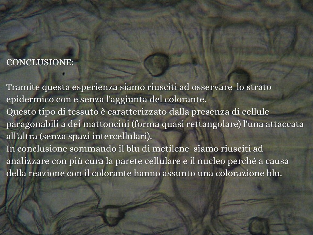 Tramite questa esperienza siamo riusciti ad osservare lo strato epidermico con e senza l'aggiunta del colorante. Questo tipo di tessuto è caratterizzato dalla presenza di cellule paragonabili a dei mattoncini (forma quasi rettangolare) l'una attaccata all'altra (senza spazi intercellulari). In conclusione sommando il blu di metilene siamo riusciti ad analizzare con più cura la parete cellulare e il nucleo perché a causa della reazione con il colorante hanno assunto una colorazione blu.