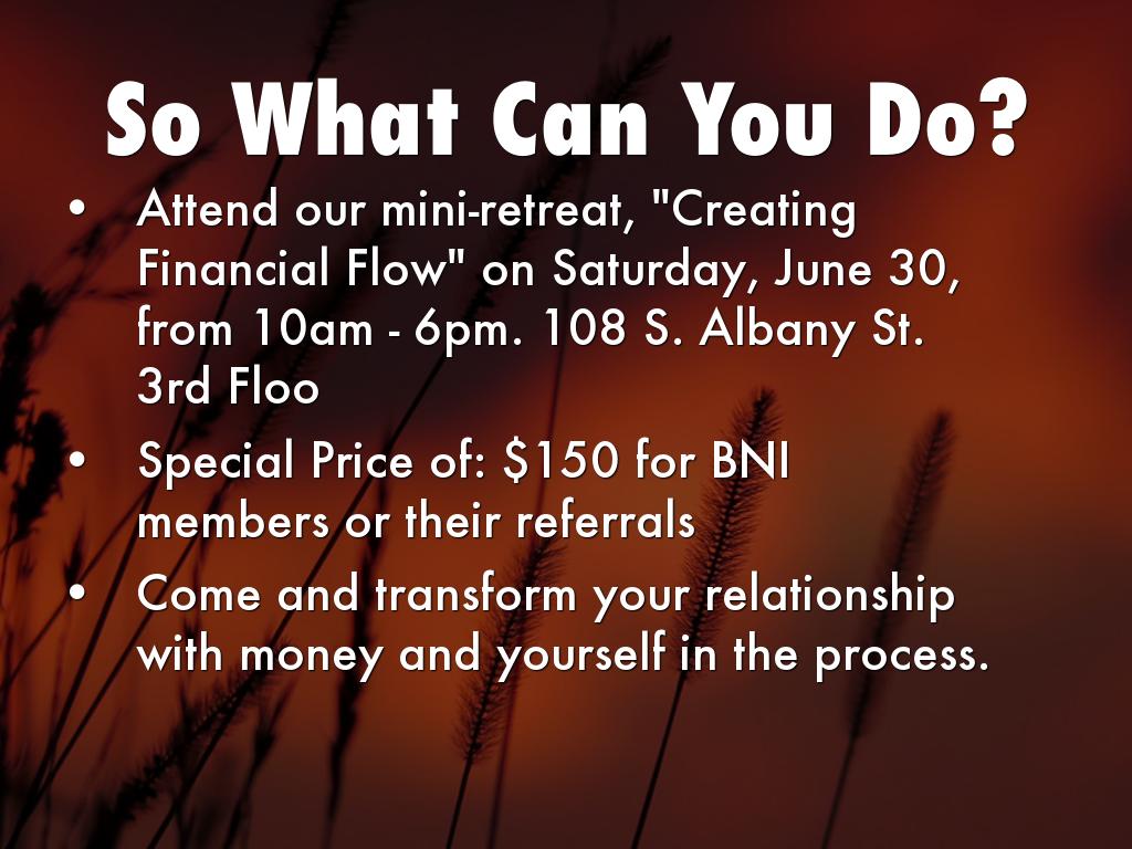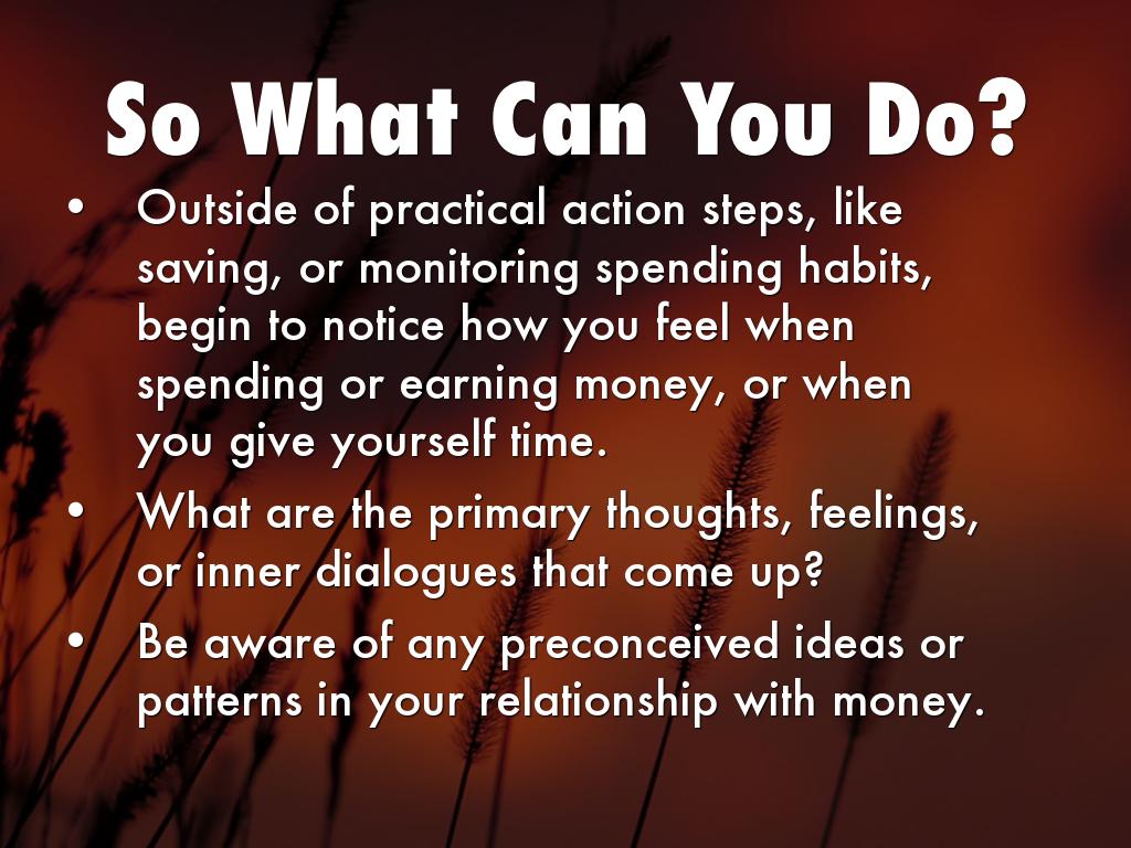 Outside of practical action steps, like saving, or monitoring spending habits, begin to notice how you feel when spending or earning money, or when you give yourself time.