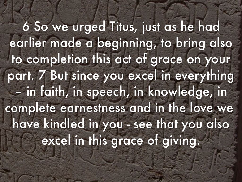 6 So we urged Titus, just as he had earlier made a beginning, to bring also to completion this act of grace on your part. 7 But since you excel in everything – in faith, in speech, in knowledge, in complete earnestness and in the love we have kindled in you - see that you also excel in this grace of giving.
