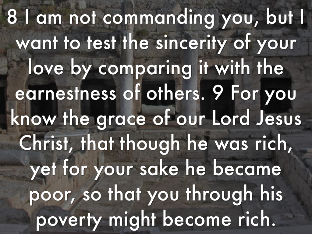 8 I am not commanding you, but I want to test the sincerity of your love by comparing it with the earnestness of others. 9 For you know the grace of our Lord Jesus Christ, that though he was rich, yet for your sake he became poor, so that you through his poverty might become rich.