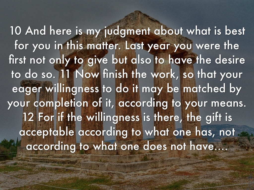 10 And here is my judgment about what is best for you in this matter. Last year you were the first not only to give but also to have the desire to do so. 11 Now finish the work, so that your eager willingness to do it may be matched by your completion of it, according to your means. 12 For if the willingness is there, the gift is acceptable according to what one has, not according to what one does not have.