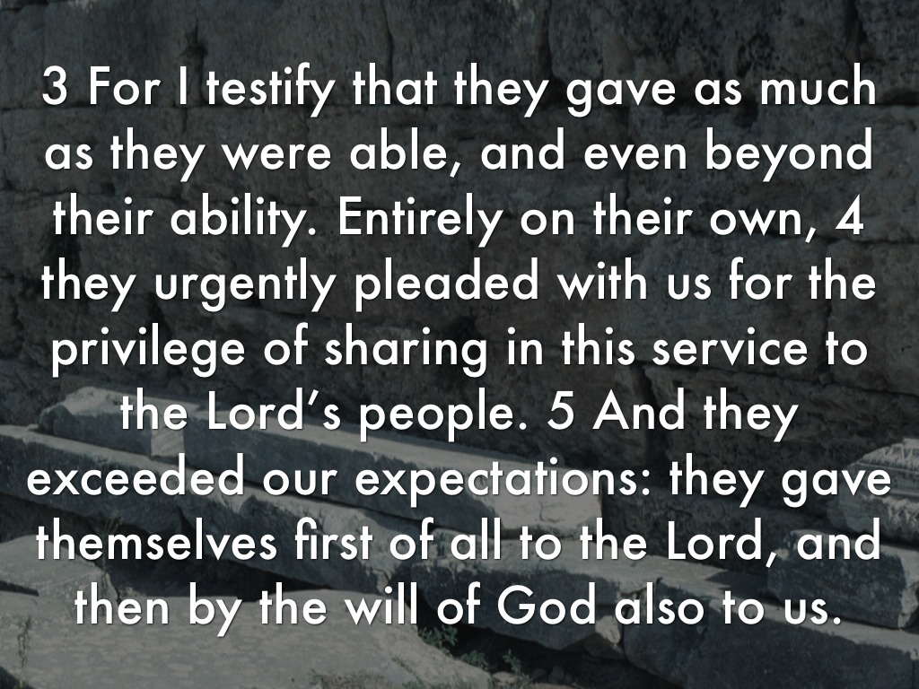 3 For I testify that they gave as much as they were able, and even beyond their ability. Entirely on their own, 4 they urgently pleaded with us for the privilege of sharing in this service to the Lord’s people. 5 And they exceeded our expectations: they gave themselves first of all to the Lord, and then by the will of God also to us.