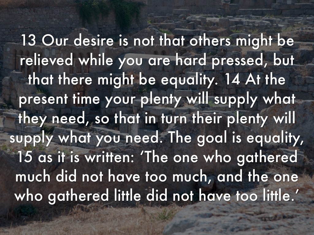13 Our desire is not that others might be relieved while you are hard pressed, but that there might be equality. 14 At the present time your plenty will supply what they need, so that in turn their plenty will supply what you need. The goal is equality, 15 as it is written: ‘The one who gathered much did not have too much, and the one who gathered little did not have too little.’