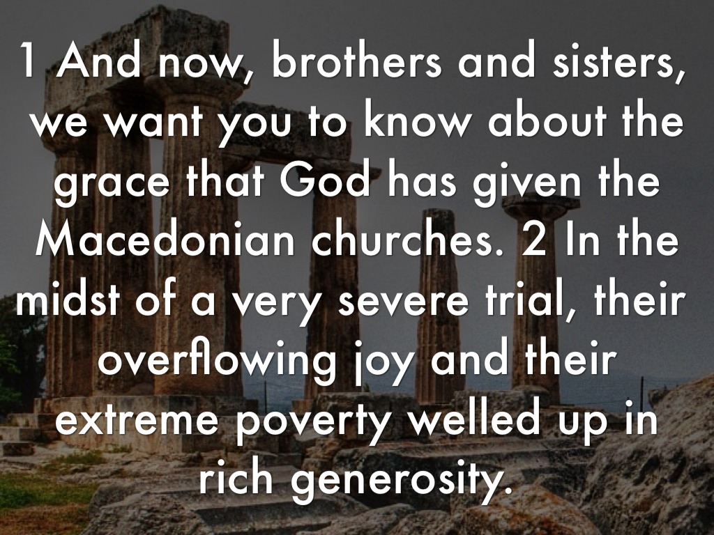 1 And now, brothers and sisters, we want you to know about the grace that God has given the Macedonian churches. 2 In the midst of a very severe trial, their overflowing joy and their extreme poverty welled up in rich generosity.