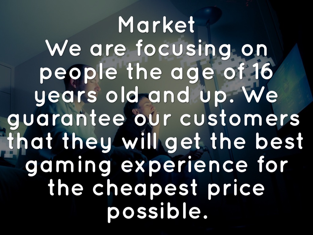 Market We are focusing on people the age of 16 years old and up. We guarantee our customers that they will get the best gaming experience for the cheapest price possible.