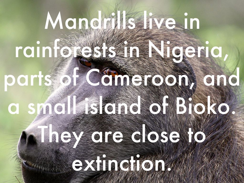 Mandrills live in rainforests in Nigeria, parts of Cameroon, and a small island of Bioko. They are close to extinction.
