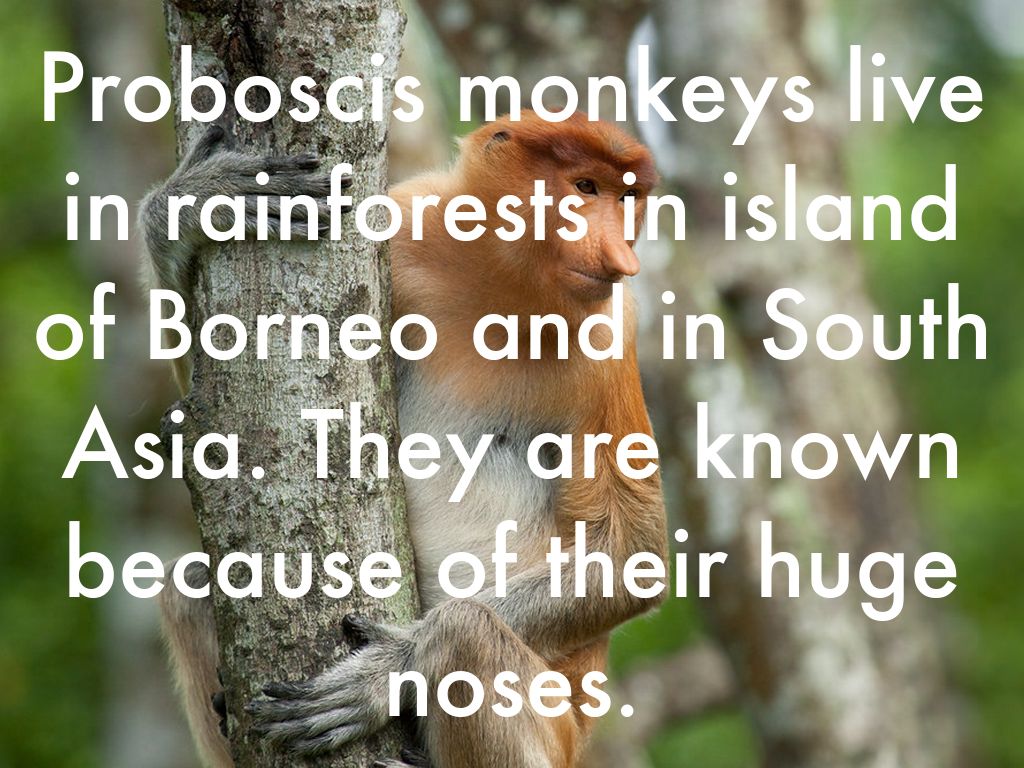 Proboscis monkeys live in rainforests in island of Borneo and in South Asia. They are known because of their huge noses.