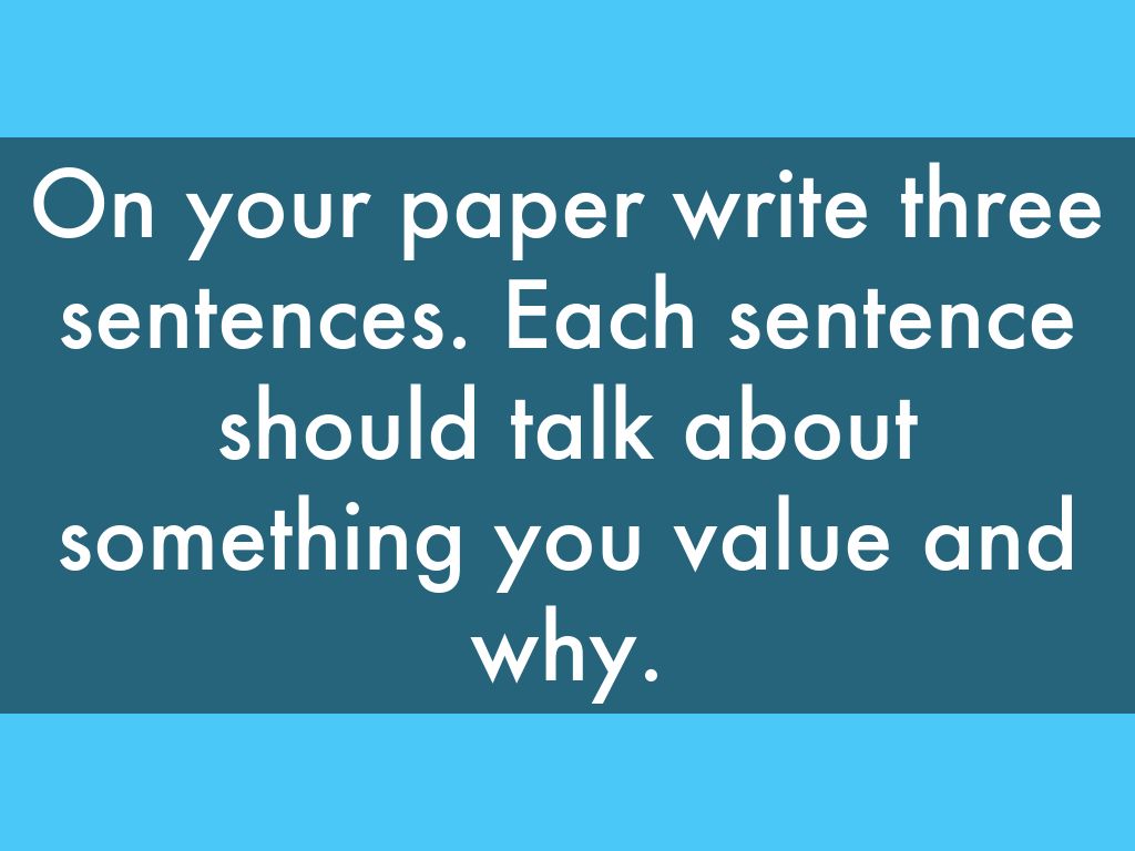 On your paper write three sentences. Each sentence should talk about something you value and why.