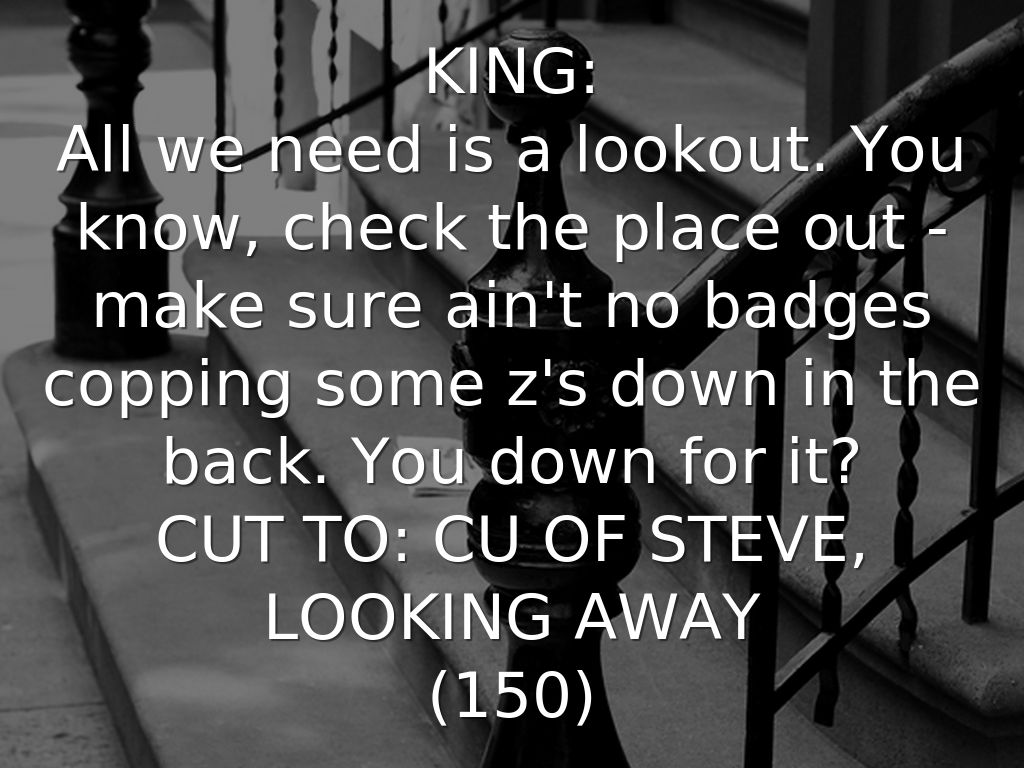 KING: All we need is a lookout. You know, check the place out - make sure ain't no badges copping some z's down in the back. You down for it? CUT TO: CU OF STEVE, LOOKING AWAY (150)