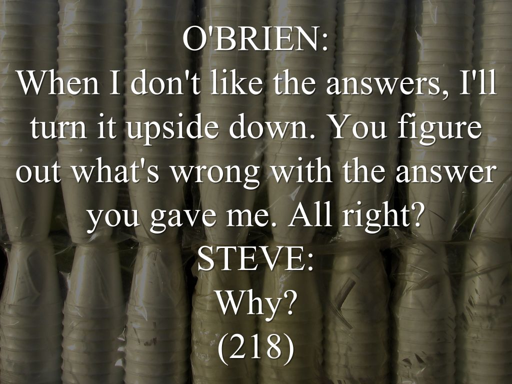 O'BRIEN: When I don't like the answers, I'll turn it upside down. You figure out what's wrong with the answer you gave me. All right? STEVE: Why? (218)