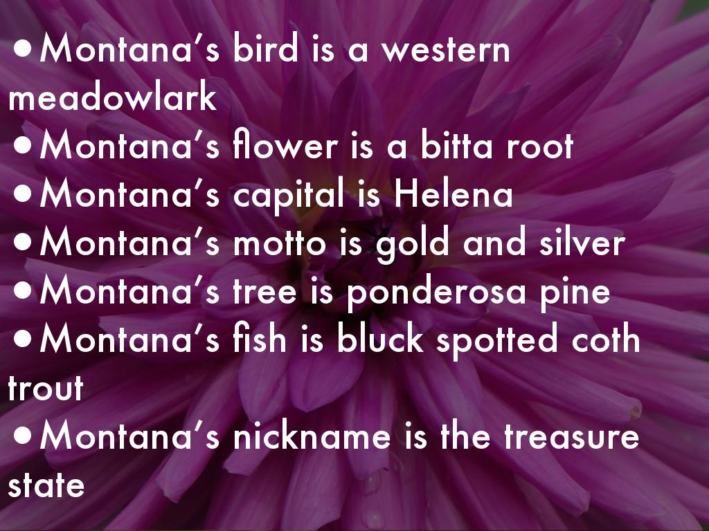 ⚫️Montana’s bird is a western meadowlark ⚫️Montana’s flower is a bitta root ⚫️Montana’s capital is Helena ⚫️Montana’s motto is gold and silver ⚫️Montana’s tree is ponderosa pine ⚫️Montana’s fish is bluck spotted coth trout ⚫️Montana’s nickname is the treasure state