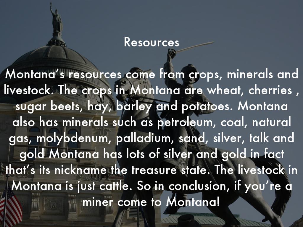 Montana’s resources come from crops, minerals and livestock. The crops in Montana are wheat, cherries , sugar beets, hay, barley and potatoes. Montana also has minerals such as petroleum, coal, natural gas, molybdenum, palladium, sand, silver, talk and gold Montana has lots of silver and gold in fact that’s its nickname the treasure state. The livestock in Montana is just cattle. So in conclusion, if you’re a miner come to Montana!