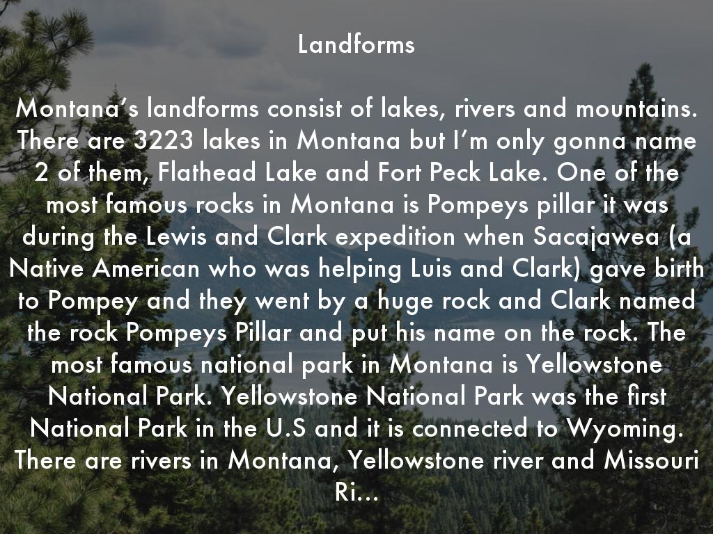 Montana’s landforms consist of lakes, rivers and mountains. There are 3223 lakes in Montana but I’m only gonna name 2 of them, Flathead Lake and Fort Peck Lake. One of the most famous rocks in Montana is Pompeys pillar it was during the Lewis and Clark expedition when Sacajawea (a Native American who was helping Luis and Clark) gave birth to Pompey and they went by a huge rock and Clark named the rock Pompeys Pillar and put his name on the rock. The most famous national park in Montana is Yellowstone National Park. Yellowstone National Park was the first National Park in the U.S and it is connected to Wyoming. There are rivers in Montana, Yellowstone river and Missouri Ri…