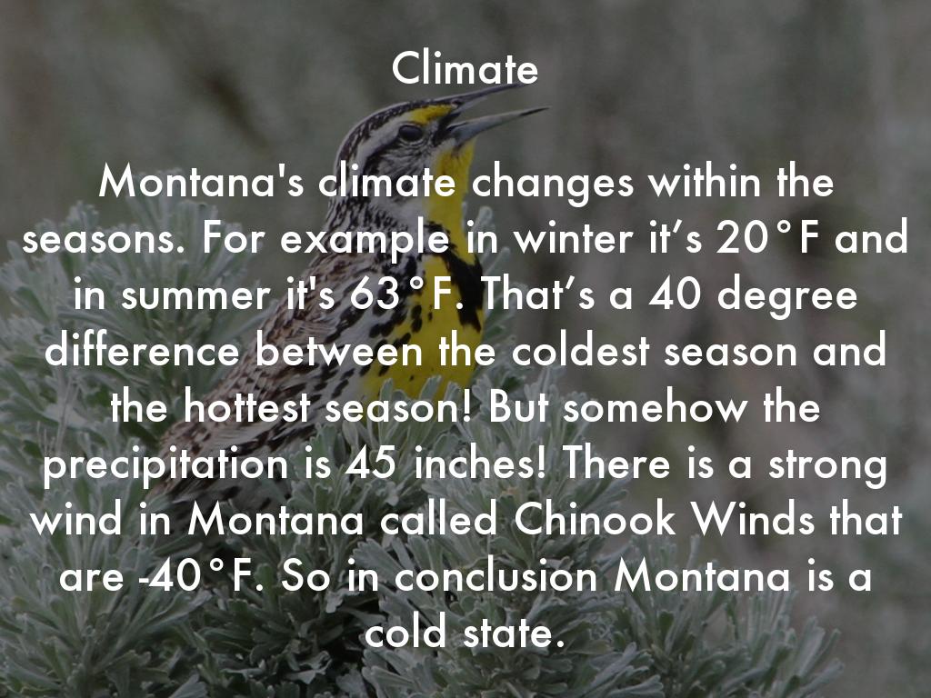 Montana's climate changes within the seasons. For example in winter it’s 20°F and in summer it's 63°F. That’s a 40 degree difference between the coldest season and the hottest season! But somehow the precipitation is 45 inches! There is a strong wind in Montana called Chinook Winds that are -40°F. So in conclusion Montana is a cold state.