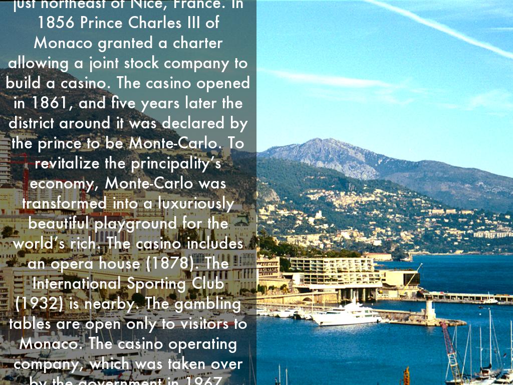 Monte-Carlo, resort, one of the four quartiers (sections) of Monaco. It is situated on an escarpment at the base of the Maritime Alps along the French Riviera, on the Mediterranean, just northeast of Nice, France. In 1856 Prince Charles III of Monaco granted a charter allowing a joint stock company to build a casino. The casino opened in 1861, and five years later the district around it was declared by the prince to be Monte-Carlo. To revitalize the principality’s economy, Monte-Carlo was transformed into a luxuriously beautiful playground for the world’s rich. The casino includes an opera house (1878). The International Sporting Club (1932) is nearby. The gambling tables are open only to visitors to Monaco. The casino operating company, which was taken over by the government in 1967, contributes less than 5 percent of the annual state budget. High-rise hotels and apartment buildings have replaced many of Monte-Carlo’s picturesque villas. Pop. (2008) 14,586; (2016) 17,372.