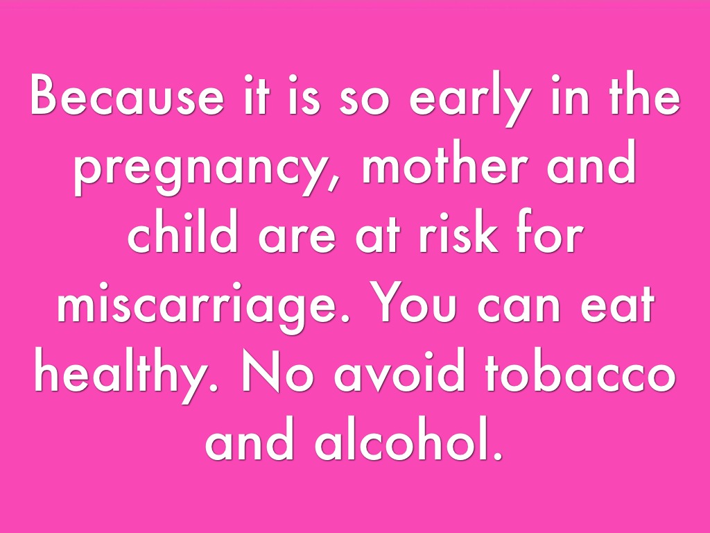 Because it is so early in the pregnancy, mother and child are at risk for miscarriage. You can eat healthy. No avoid tobacco and alcohol.