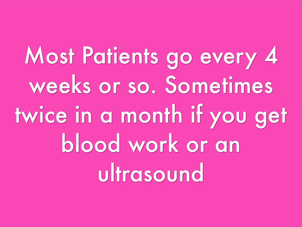 Most Patients go every 4 weeks or so. Sometimes twice in a month if you get blood work or an ultrasound