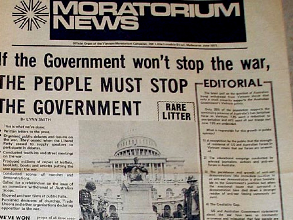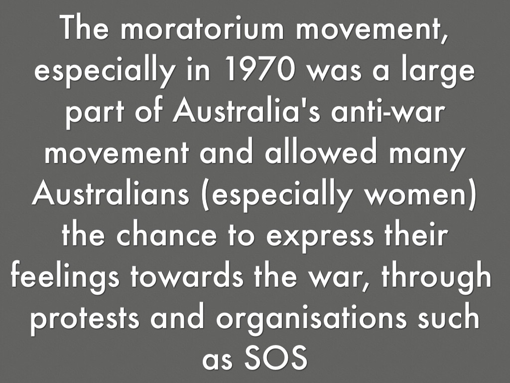 The moratorium movement, especially in 1970 was a large part of Australia's anti-war movement and allowed many Australians (especially women) the chance to express their feelings towards the war, through protests and organisations such as SOS