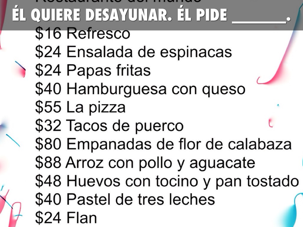 ÉL QUIERE DESAYUNAR. ÉL PIDE ______.