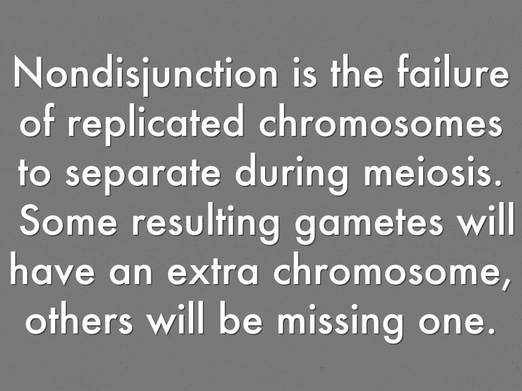 Nondisjunction is the failure of replicated chromosomes to separate during meiosis. Some resulting gametes will have an extra chromosome, others will be missing one.