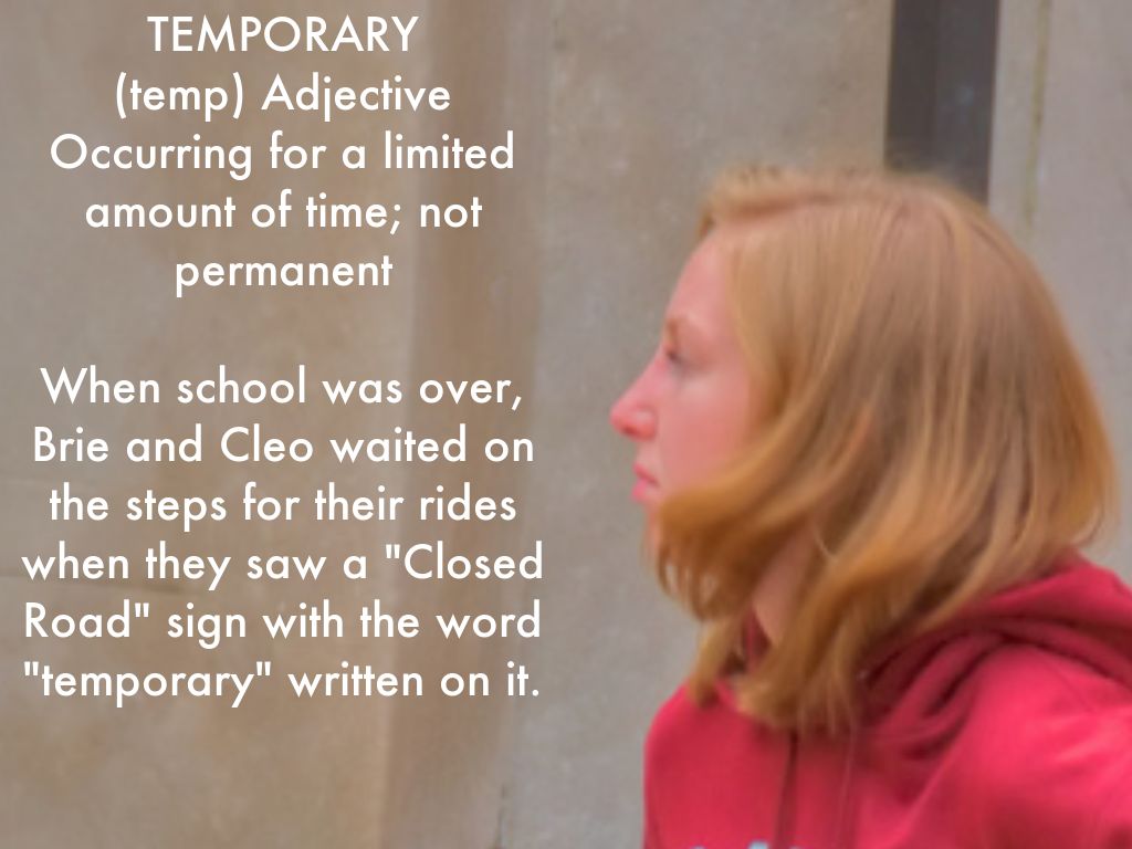 When school was over, Brie and Cleo waited on the steps for their rides when they saw a "Closed Road" sign with the word "temporary" written on it.