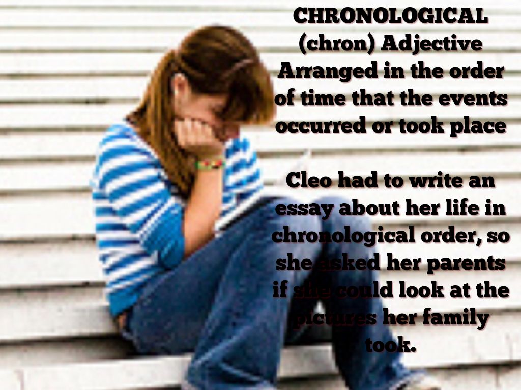 Cleo had to write an essay about her life in chronological order, so she asked her parents if she could look at the pictures her family took.