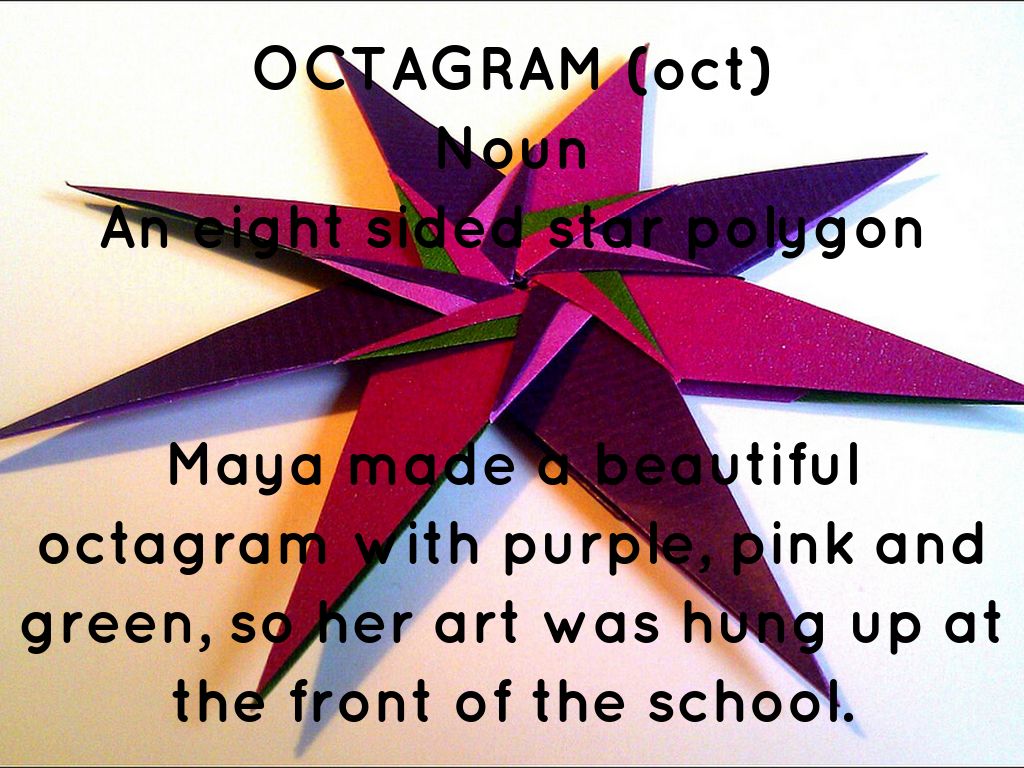 Maya made a beautiful octagram with purple, pink and green, so her art was hung up at the front of the school.