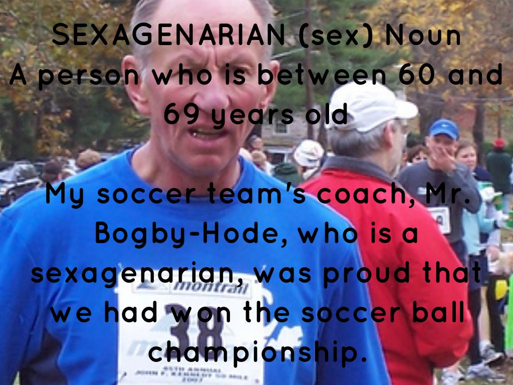 My soccer team's coach, Mr. Bogby-Hode, who is a sexagenarian, was proud that we had won the soccer ball championship.