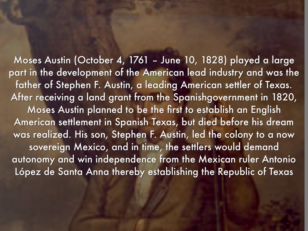 Moses Austin (October 4, 1761 – June 10, 1828) played a large part in the development of the American lead industry and was the father of Stephen F. Austin, a leading American settler of Texas. After receiving a land grant from the Spanishgovernment in 1820, Moses Austin planned to be the first to establish an English American settlement in Spanish Texas, but died before his dream was realized. His son, Stephen F. Austin, led the colony to a now sovereign Mexico, and in time, the settlers would demand autonomy and win independence from the Mexican ruler Antonio López de Santa Anna thereby establishing the Republic of Texas