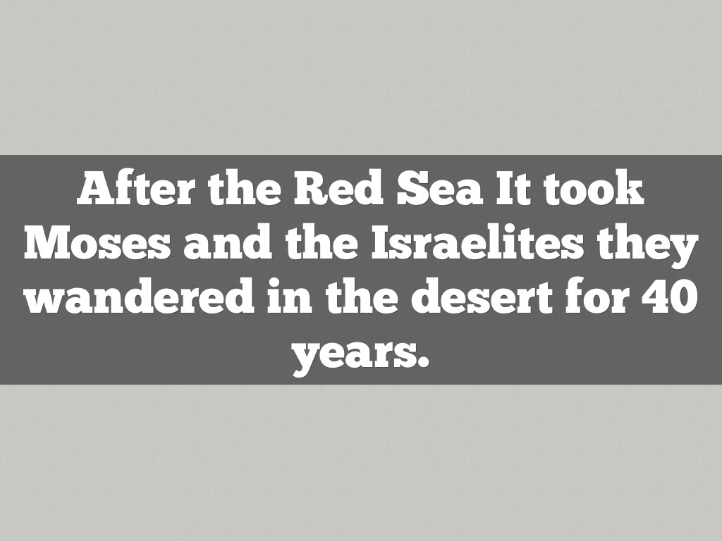 After the Red Sea It took Moses and the Israelites they wandered in the desert for 40 years.