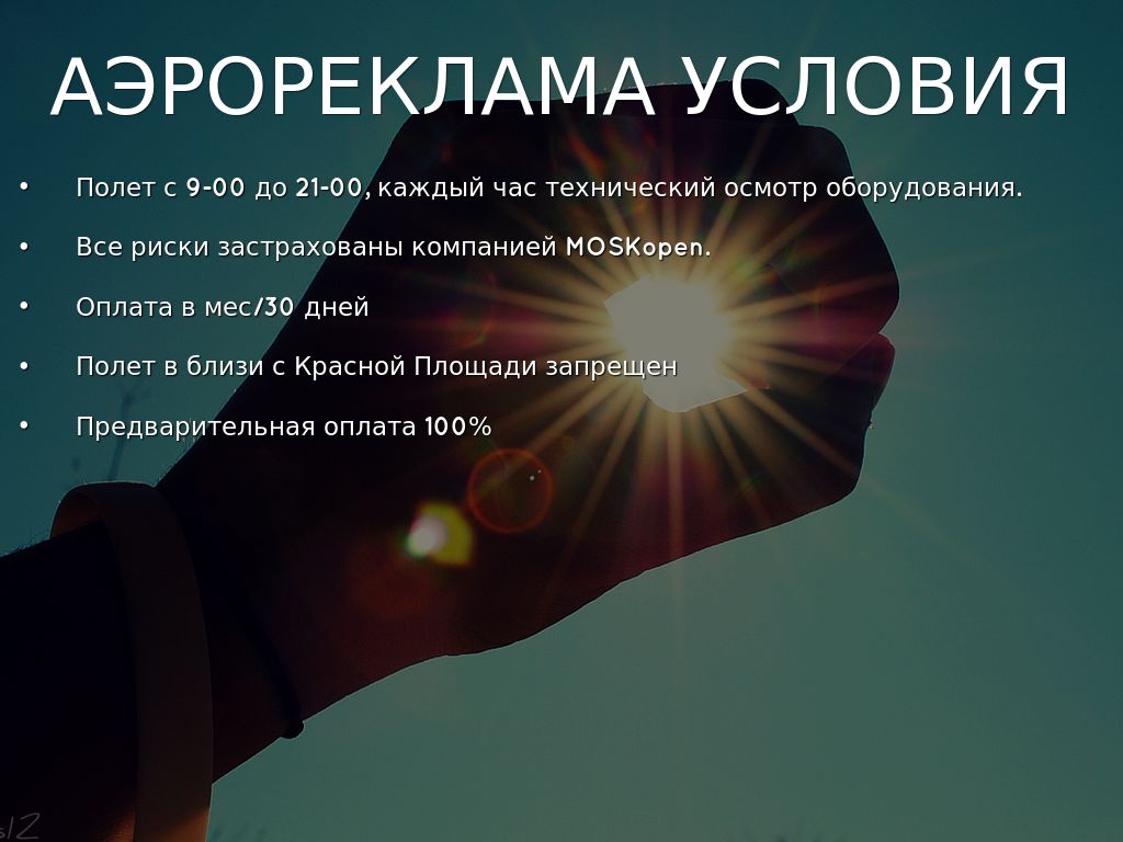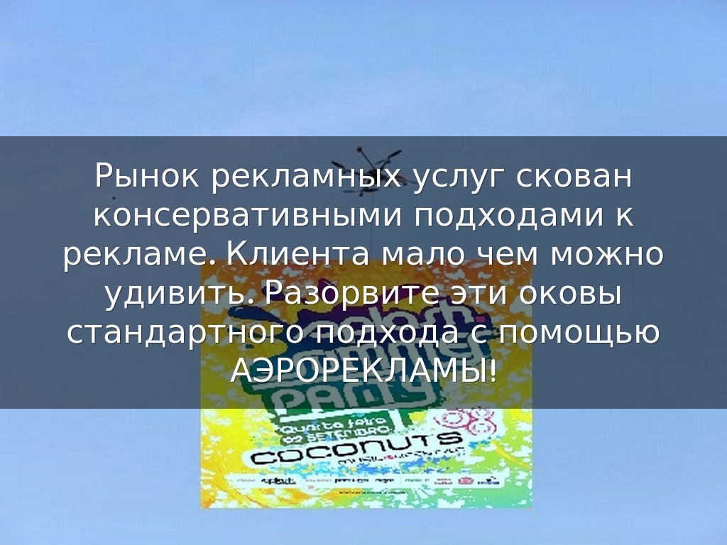 Рынок рекламных услуг скован консервативными подходами к рекламе. Клиента мало чем можно удивить. Разорвите эти оковы стандартного подхода с помощью АЭРОРЕКЛАМЫ!