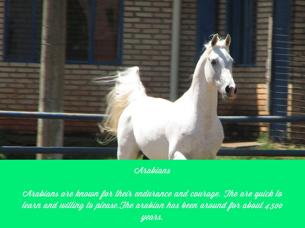 Arabians are known for their endurance and courage. The are quick to learn and willing to please.The arabian has been around for about 4,500 years.