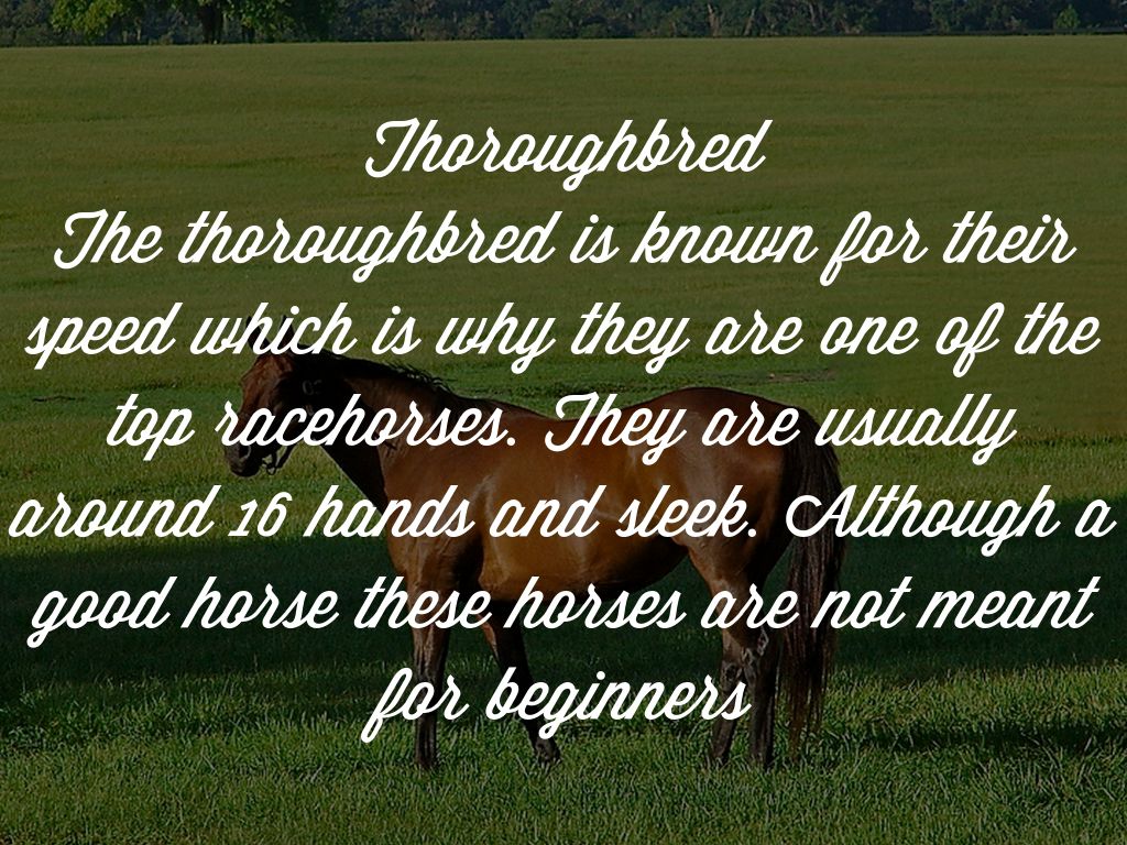 The thoroughbred is known for their speed which is why they are one of the top racehorses. They are usually around 16 hands and sleek. Although a good horse these horses are not meant for beginners