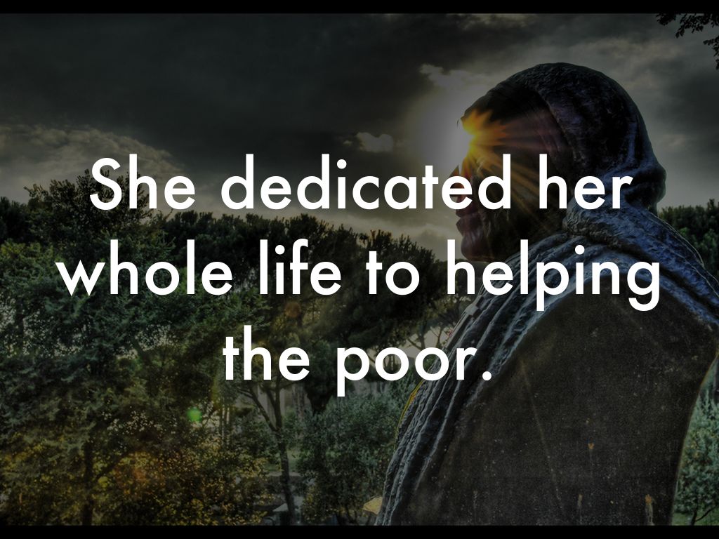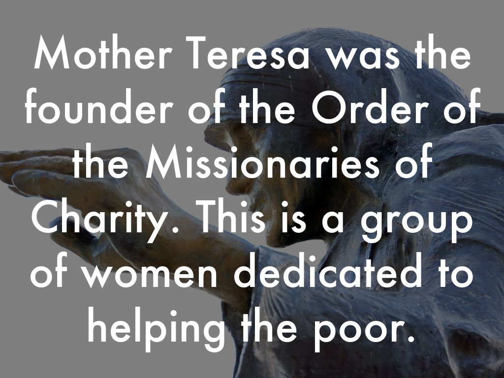 Mother Teresa was the founder of the Order of the Missionaries of Charity. This is a group of women dedicated to helping the poor.