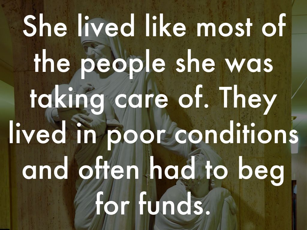 She lived like most of the people she was taking care of. They lived in poor conditions and often had to beg for funds.