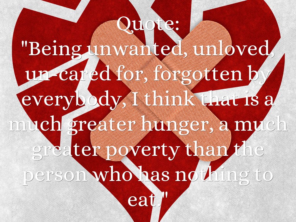 "Being unwanted, unloved, un-cared for, forgotten by everybody, I think that is a much greater hunger, a much greater poverty than the person who has nothing to eat."