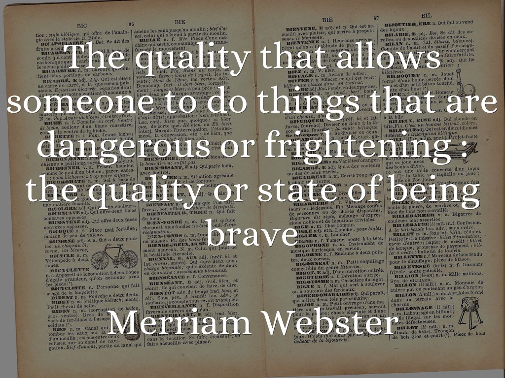 The quality that allows someone to do things that are dangerous or frightening : the quality or state of being brave