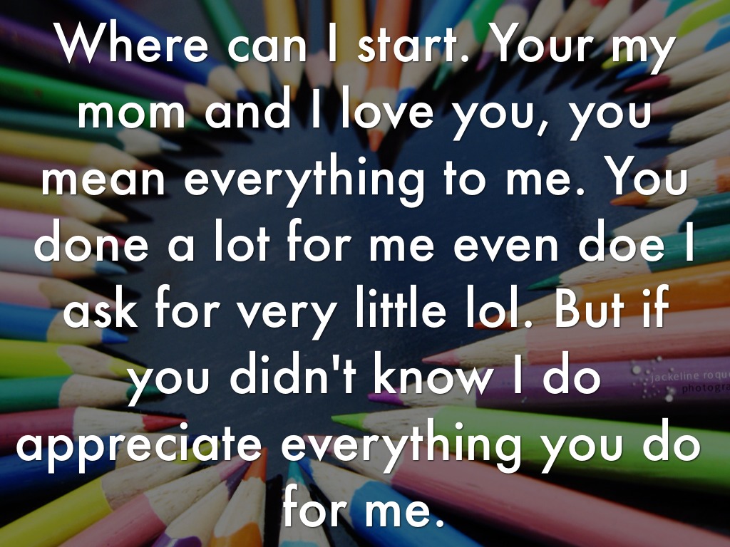Where can I start. Your my mom and I love you, you mean everything to me. You done a lot for me even doe I ask for very little lol. But if you didn't know I do appreciate everything you do for me.