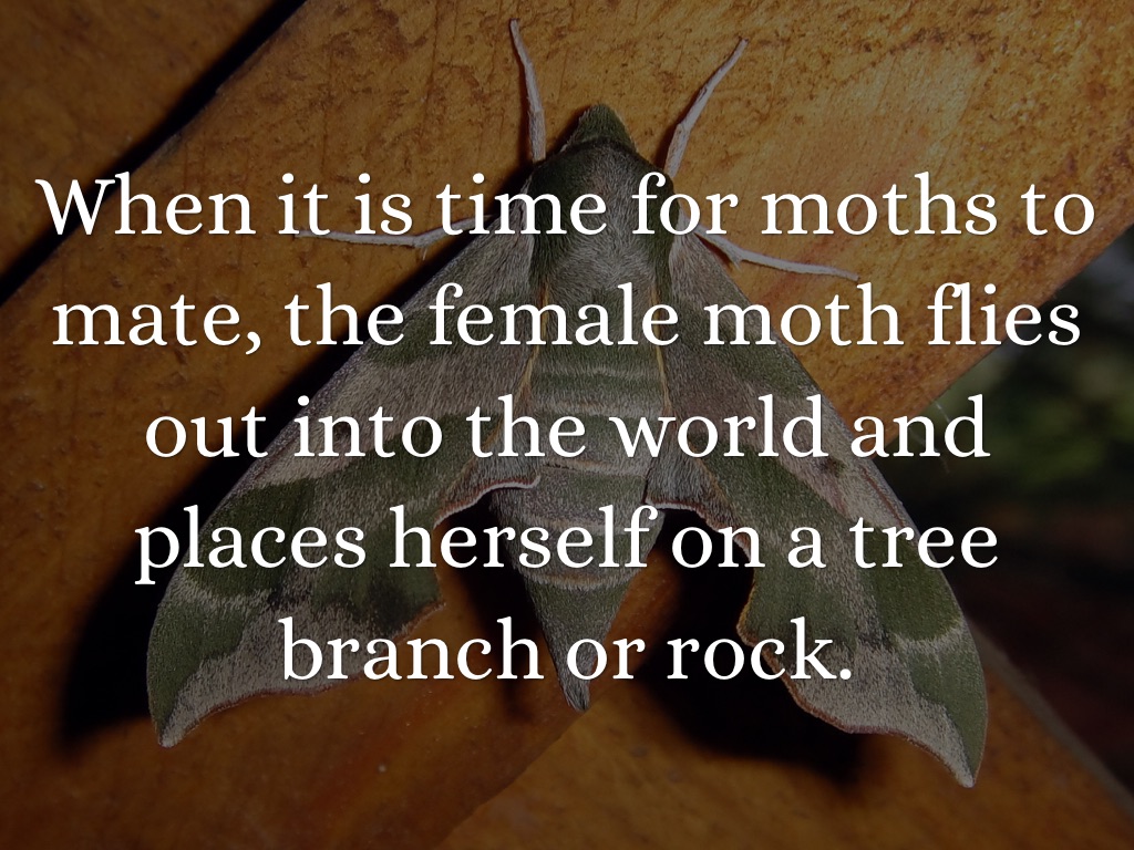 When it is time for moths to mate, the female moth flies out into the world and places herself on a tree branch or rock.