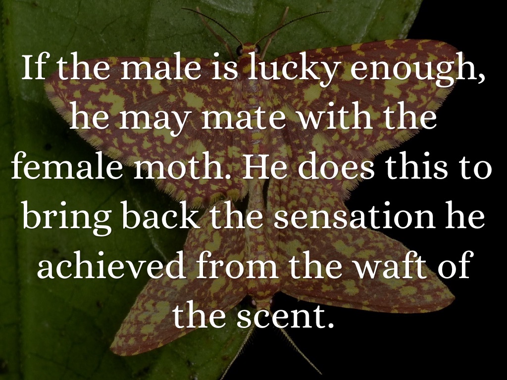If the male is lucky enough, he may mate with the female moth. He does this to bring back the sensation he achieved from the waft of the scent.
