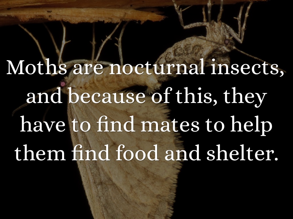 Moths are nocturnal insects, and because of this, they have to find mates to help them find food and shelter.