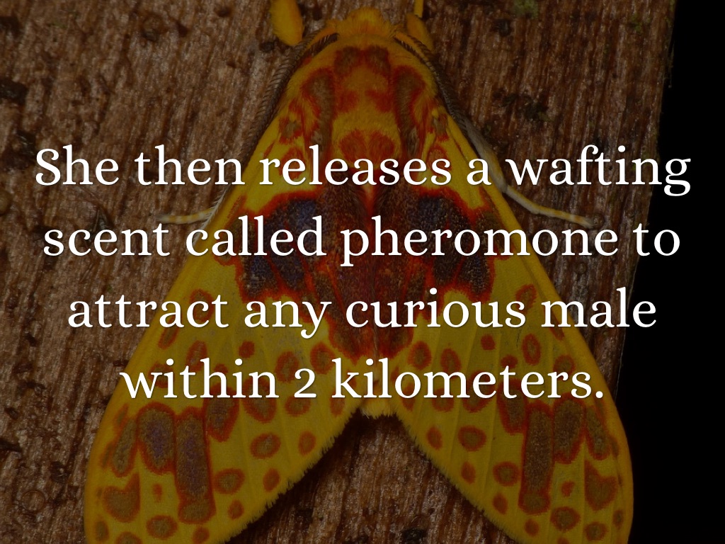She then releases a wafting scent called pheromone to attract any curious male within 2 kilometers.