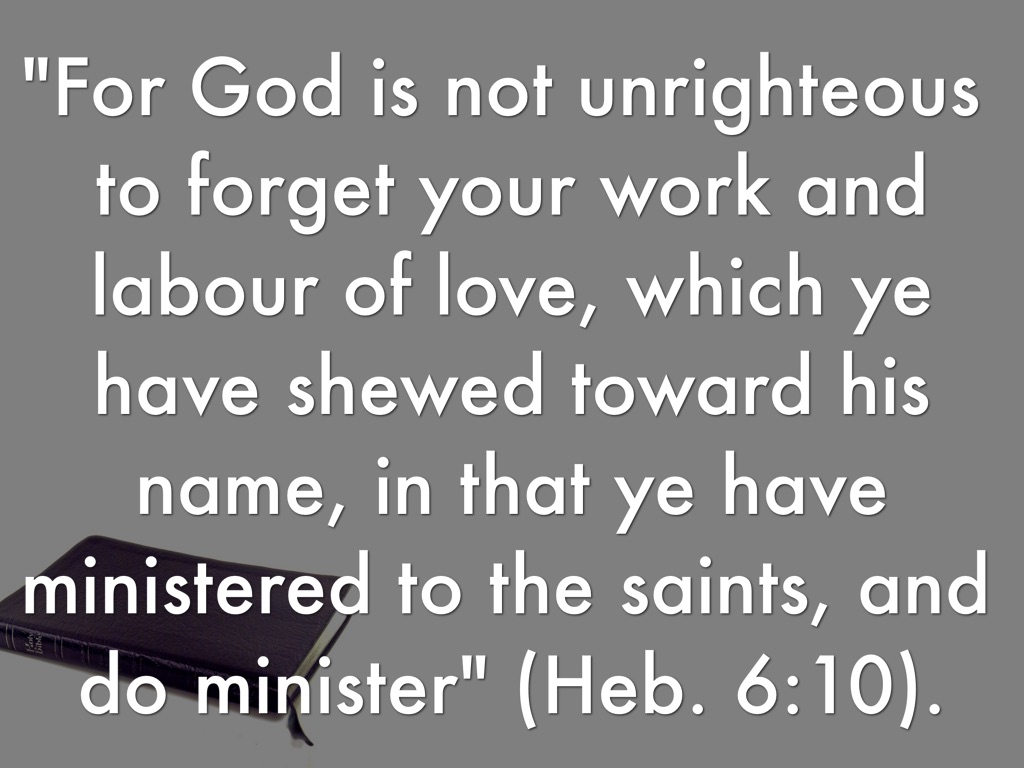 "For God is not unrighteous to forget your work and labour of love, which ye have shewed toward his name, in that ye have ministered to the saints, and do minister" (Heb. 6:10).