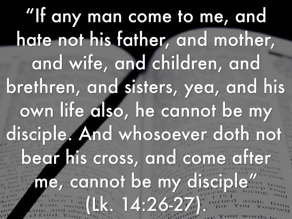 “If any man come to me, and hate not his father, and mother, and wife, and children, and brethren, and sisters, yea, and his own life also, he cannot be my disciple. And whosoever doth not bear his cross, and come after me, cannot be my disciple” (Lk. 14:26-27).